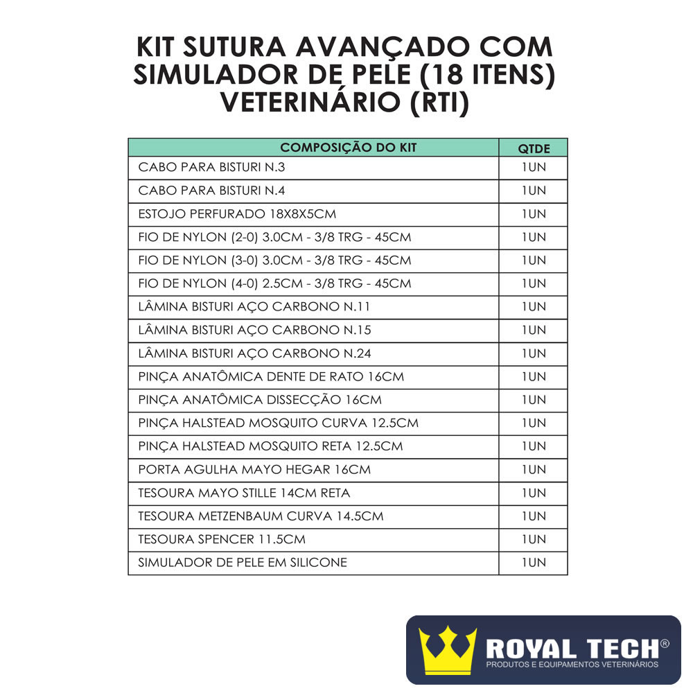 O kit de sutura avançado da Royal Tech Import é confeccionado com componentes de alta qualidade para proporcionar um procedimento cirúrgico com maior precisão. Possui em sua composição um simulador de pele em silicone com diversos cortes para auxiliar os treinamentos das suturas. Produto comercializado não estéril, necessitando ser esterilizado antes do uso caso for utilizado em pacientes. Após ser utilizado o produto deverá ser lavado e seco imediatamente.