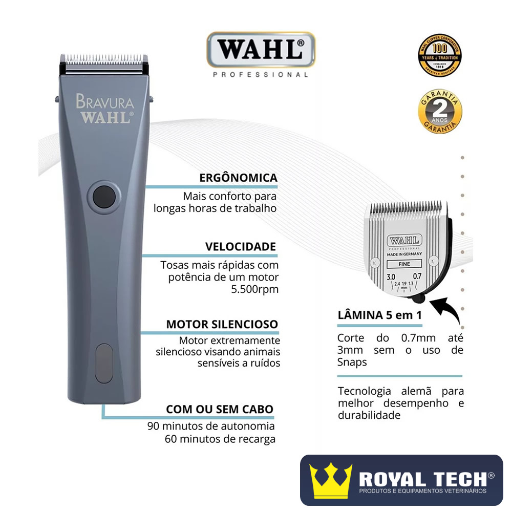 A Bravura da Wahl combina o poder e a durabilidade da inovação da bateria de íons de lítio com a lâmina 5 em 1 ajustável para oferecer aos profissionais tudo o que eles precisam em uma máquina de tosa sem fio! A bateria recarregável de íons de lítio do Bravura tem autonomia de 90 minutos e funcionará com potência máxima até que esteja completamente descarregada. Recarregue em 60 minutos ou simplesmente conecte o cabo e continue a trabalhar. A Bravura foi projetada para oferecer o máximo de conforto ao tosador, ela é leve para evitar a fadiga do pulso e a o corpo da máquina garante controle do corte sem sacrificar o bem estar do profissional durante o trabalho.