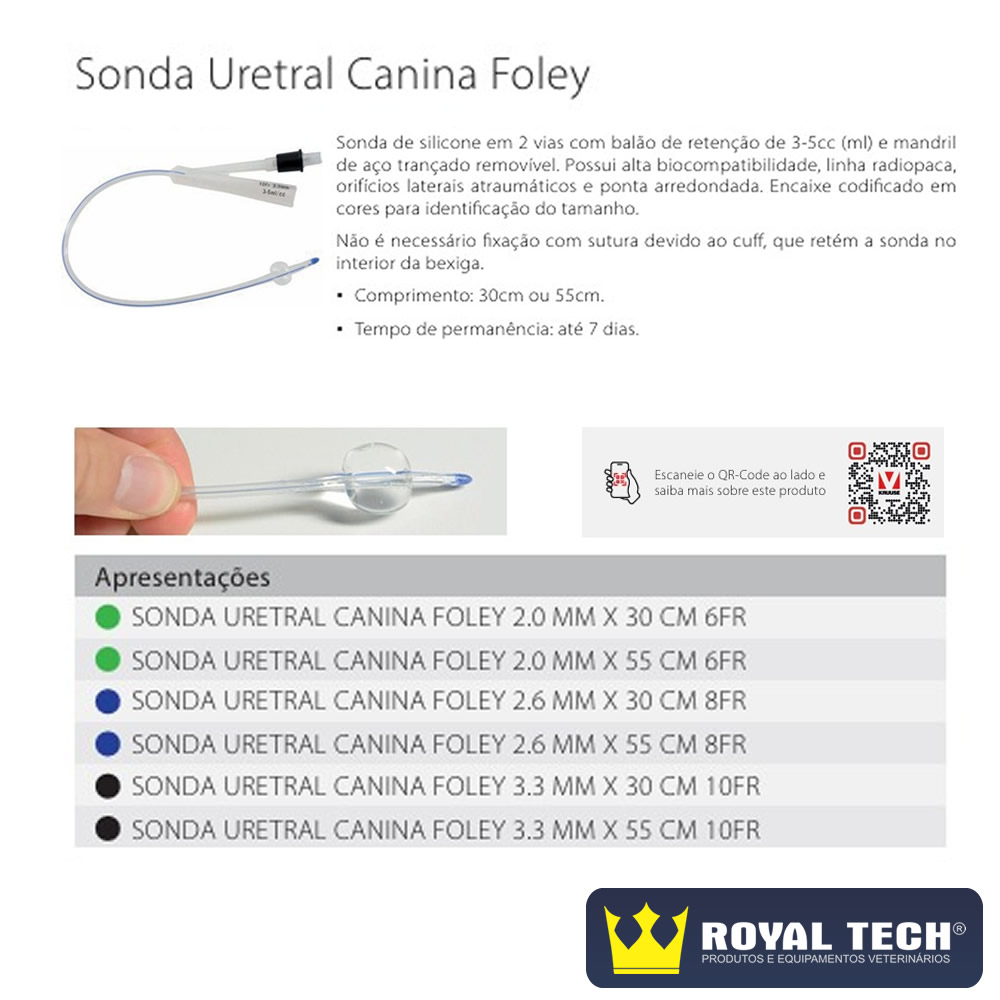 Sonda Uretral Canina Foley de silicone em 2 vias com balão de retenção de 3-5cc (ml) e mandril de aço trançado removível. Possui alta biocompatibilidade, linha radiopaca, orifícios laterais atraumáticos e ponta arredondada. Encaixe codificado em cores para identificação do tamanho. Não é necessário fixação com sutura devido ao cuff, que retém a sonda no interior da bexiga. Comprimento: 55 cm e tempo de permanência: até 7 dias